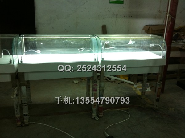 弧形玻璃的條形柜的柜腿為鏡面不銹鋼,玻璃為8厘異形帶弧度的玻璃,這類型的玻璃在制作前需要首先開模,然后再按照磨具制作,柜臺(tái)里面的燈具是專業(yè)訂做的彎曲的弧形燈座。