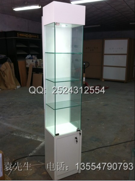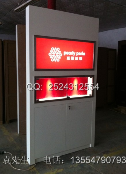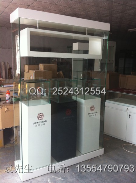 珍珠展示柜采用中纖板做白色亮光烤漆,LED冷光源燈具,LOGO為絲印。柜體里面包紅色絨布。玻璃正開門玫瑰金包邊。
