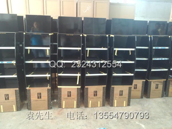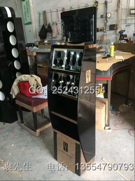 香港化妝品展臺尺寸;390*245*1450mm,柜體中纖板黑色亮光烤漆,香檳金顏色不銹鋼,黑色絲印LOGO。