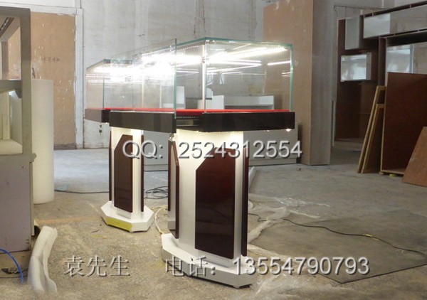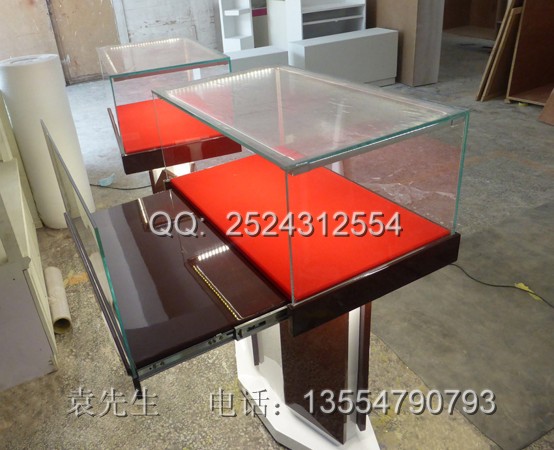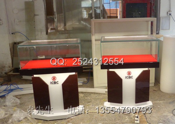 深圳工商銀行精品展柜分為二款;一款是常規的條柜,尺寸;1000*500*900mm,柜臺采用中纖板做基層,表面白色和咖啡色亮光烤漆,玻璃為超白玻璃,臺面包紅色皮革。柜臺外面四周也一圈LED燈具,亞克力水晶字,玻璃抽拉門。