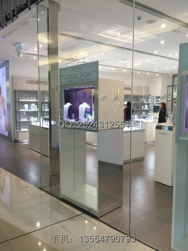 深圳施華洛世奇飾品展柜由我司訂做加工,展柜是中纖板做基層,表面白色亮光烤漆處理,不銹鋼工藝和木質結構完美結合,飾品展柜的每層層板安置大量的牛眼射燈,燈光的反射會使展柜內的產品產生連續感,最大限度的展示產品。整個店面的整體布局體現高貴的品質,典雅的外觀,奢華的展示效果。