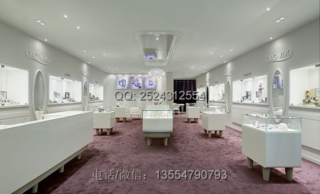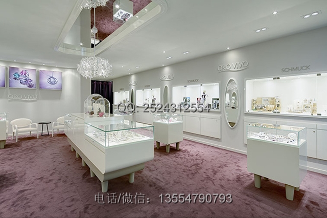 白色的珠寶展柜做工精細(xì),提升整個(gè)店面的檔次。紫羅蘭地板、舒適的扶手椅墊和天鵝絨窗簾匹配的顏色裝飾讓顧客感到舒適溫馨。
