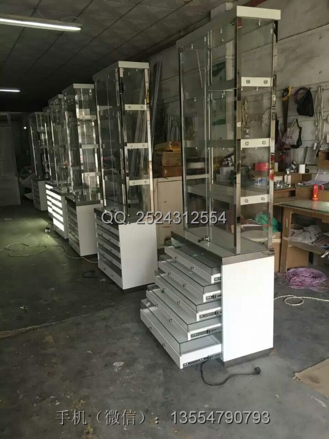 飾品展柜尺寸:600*300*2200mm,密度板白色亮光烤漆,玻璃都為8厘超白鋼化玻璃,鏡面不銹鋼包邊,每層層板下面8個(gè)正白光牛眼射燈。