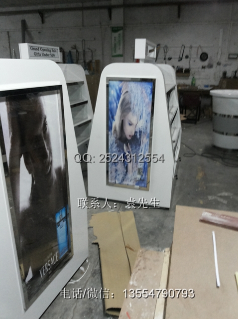 此款化妝品展柜一共12個,都是獨立的中島柜,展柜尺寸:1200*600*1250mm,展柜是雙面展示產品的,2邊的側面是2個燈箱。展柜上下4層,最下面是抽屜,擺放產品區域的門是亞克力帶鎖,側面是鏡面不銹鋼包邊。由于發往國外展柜都為木箱包裝。