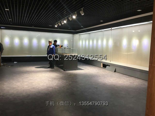 工藝要求:1.5mm冷軋鋼板做基層,50*50鐵方通做龍骨結構,表面深灰色啞光粉末噴涂烤漆,5+5夾膠超白玻璃 ,展柜背板和臺面包麻布。