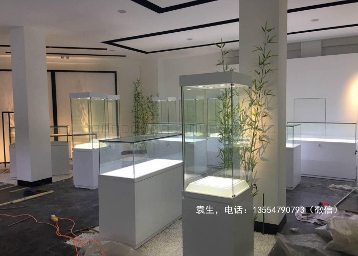 展廳布置規劃的展柜也是三款,都是采用大芯板做基層,表面密度板做白色烤漆工藝。方形獨立柜常規尺寸:600*600*1800mm,方形獨立柜如圖所示分為一種下面帶地柜另外一種是下面不帶地柜全玻璃的,這樣的獨立柜頂部都是帶射燈,中間是梯形臺。長方形條柜尺寸:1200*500*1000mm,如有需要定制此類展柜,你可以電話聯系袁生:13554790793(微信號)。