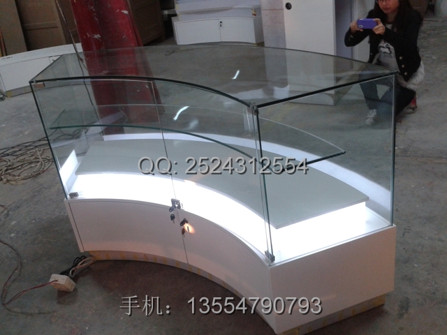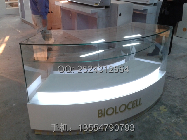 弧形化妝品展示柜高密度板做基層,表面白色亮光油漆處理,此款化妝品展柜是出口到澳大利亞的,柜臺尺寸:1800*500*1000mm,展柜包裝為木箱包裝,由于柜臺為弧形的,玻璃需要開模熱彎,造價也會偏高點。