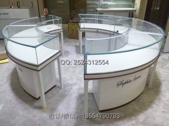 如上圖的珠寶展柜是四個半圓形組合在一起,展柜的價格是4600元一米(外弧長),展柜白色亮光烤漆,金色不銹鋼包邊。
